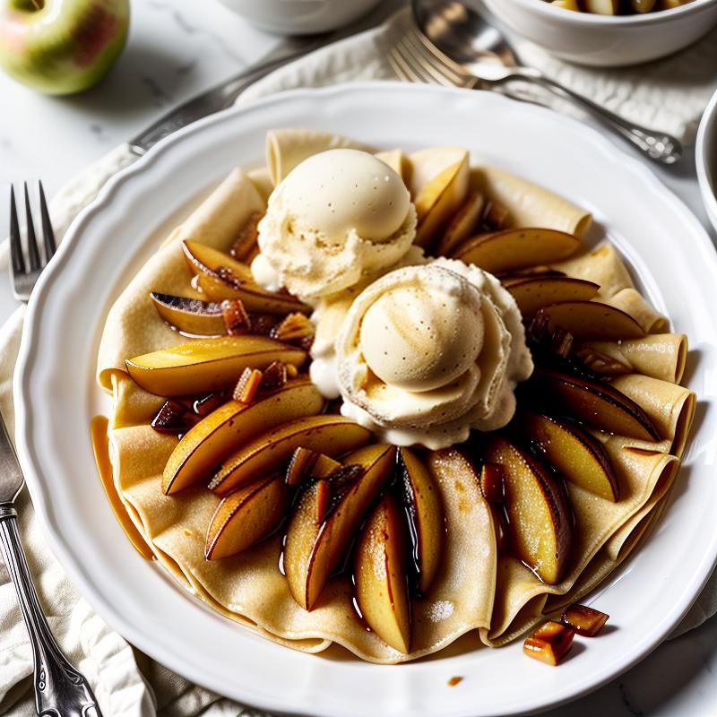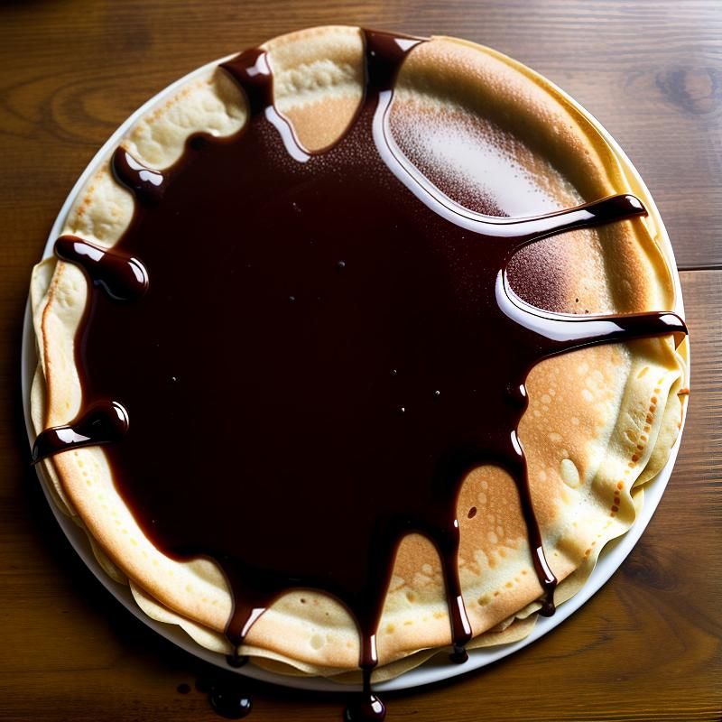 Crêpe moelleuse nappée de chocolat fondant, servie avec une boule de glace.